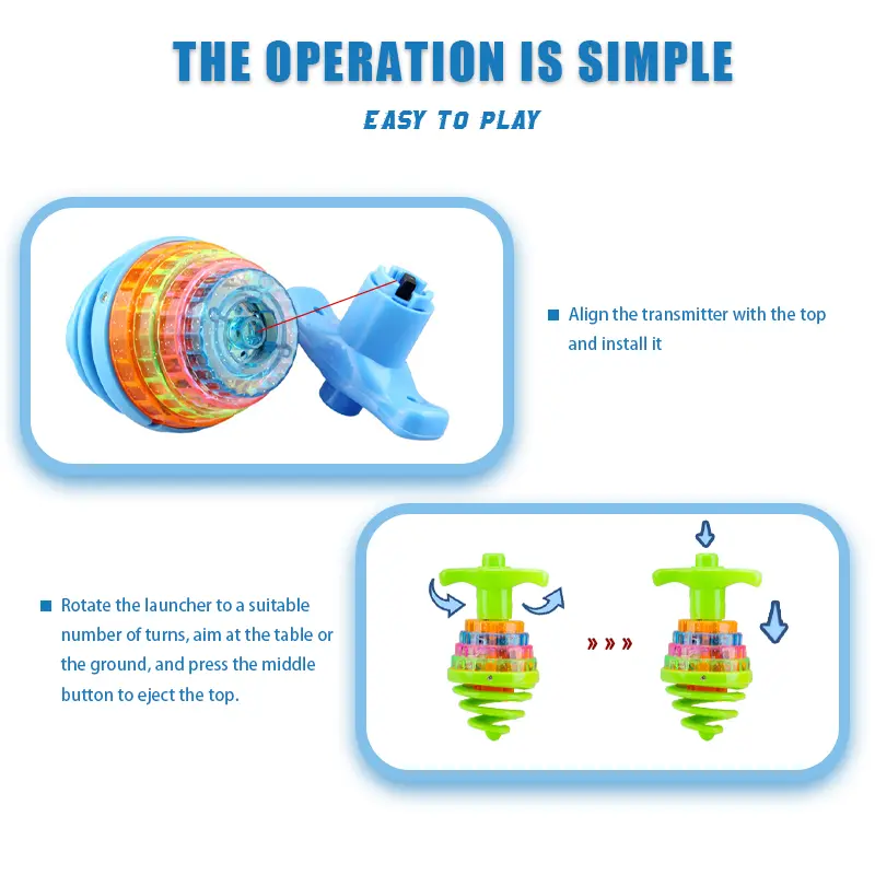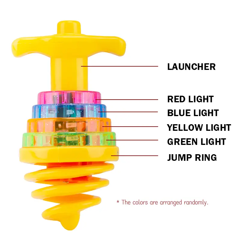 ಲೈಟ್-ಅಪ್ ಮ್ಯೂಸಿಕಲ್ ಬೌನ್ಸ್ ಸ್ಪಿನ್ನಿಂಗ್ ಟಾಪ್ನ ಪ್ರಾಥಮಿಕ ಕಾರ್ಯವೆಂದರೆ ಅದು ಮೋಡಿಮಾಡುವ ರೀತಿಯಲ್ಲಿ ತಿರುಗುವ ಮತ್ತು ಸುತ್ತುವ ಸಾಮರ್ಥ್ಯವಾಗಿದ್ದು, ಅದನ್ನು ಕ್ರಿಯೆಯಲ್ಲಿ ನೋಡುವ ಯಾರ ಗಮನವನ್ನೂ ಸೆಳೆಯುತ್ತದೆ. ಅದು ತಿರುಗುತ್ತಿದ್ದಂತೆ, ಮೇಲ್ಭಾಗವು ವರ್ಣರಂಜಿತ ದೀಪಗಳ ಸುಂದರವಾದ ಶ್ರೇಣಿಯನ್ನು ಹೊರಸೂಸುತ್ತದೆ, ಮೋಡಿಮಾಡುವ ದೃಶ್ಯ ಪ್ರದರ್ಶನವನ್ನು ಸೃಷ್ಟಿಸುತ್ತದೆ, ಅದು ಖಂಡಿತವಾಗಿಯೂ ಸಂತೋಷ ಮತ್ತು ಪ್ರಭಾವ ಬೀರುತ್ತದೆ. ಇದರ ಜೊತೆಗೆ, ಮೇಲ್ಭಾಗವು ಹರ್ಷಚಿತ್ತದಿಂದ ಸಂಗೀತವನ್ನು ನುಡಿಸುತ್ತದೆ, ಆಟದ ಅನುಭವಕ್ಕೆ ವಿನೋದ ಮತ್ತು ಉತ್ಸಾಹದ ಹೆಚ್ಚುವರಿ ಅಂಶವನ್ನು ಸೇರಿಸುತ್ತದೆ.