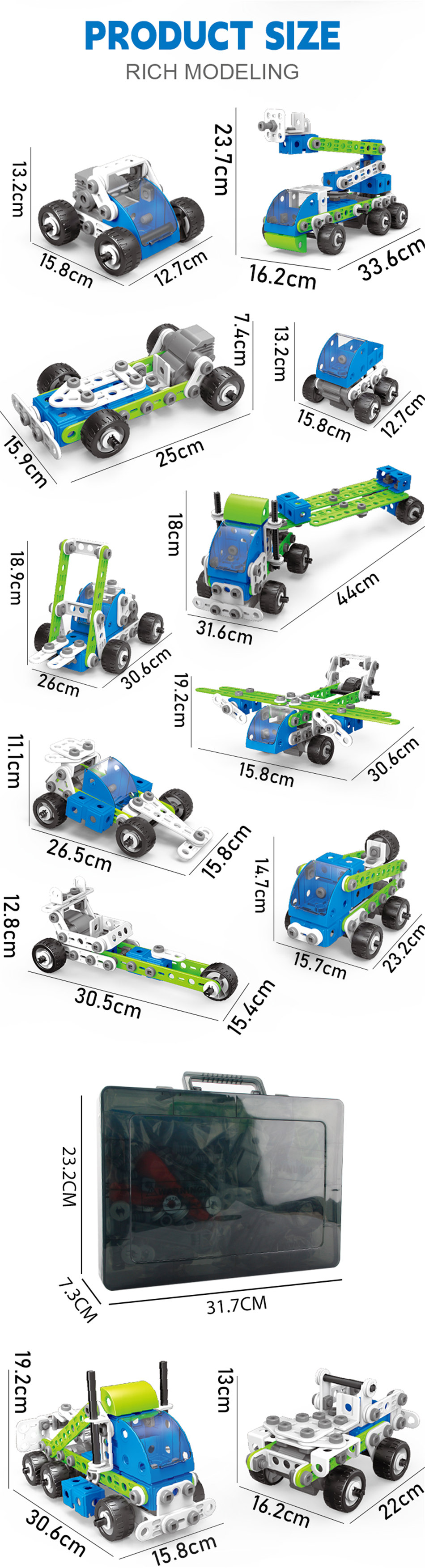 ເຄື່ອງຫຼີ້ນການປະກອບສະກູນີ້ປະກອບດ້ວຍ 175 ອຸປະກອນເສີມ, ເຊິ່ງສາມາດປະກອບເປັນ 18 ຮູບຮ່າງທີ່ແຕກຕ່າງກັນ (18 ບໍ່ສາມາດປະກອບໃນເວລາດຽວກັນ). ພວກເຮົາໄດ້ໃຫ້ຄໍາແນະນໍາທີ່ຈະຊ່ວຍໃຫ້ເດັກນ້ອຍປະກອບຢ່າງສະດວກ. ໃນຂະບວນການປະກອບ, ເດັກນ້ອຍບໍ່ພຽງແຕ່ອອກກໍາລັງກາຍສະຕິປັນຍາຂອງເຂົາເຈົ້າ, ແຕ່ຍັງປັບປຸງຄວາມສາມາດໃນການປະສານງານຕາຂອງມືຂອງເຂົາເຈົ້າ. ນີ້ແມ່ນສ່ວນໃຫຍ່ແມ່ນການປະກອບຂອງຍານພາຫະນະວິສະວະກໍາທີ່ມີຮູບຮ່າງທີ່ແຕກຕ່າງກັນ. ມັນຖືກເຊື່ອມຕໍ່ໂດຍ screws ແລະແກ່ນ. ທັງຫມົດແມ່ນເຕັມໄປດ້ວຍຄວາມຮູ້ສຶກທາງວິທະຍາສາດແລະເຕັກໂນໂລຢີແລະຄວາມຮູ້ສຶກກົນຈັກ, ເຊິ່ງເຮັດໃຫ້ຄວາມກະຕືລືລົ້ນຂອງເດັກຊາຍສໍາລັບເຄື່ອງຈັກວິສະວະກໍາ.